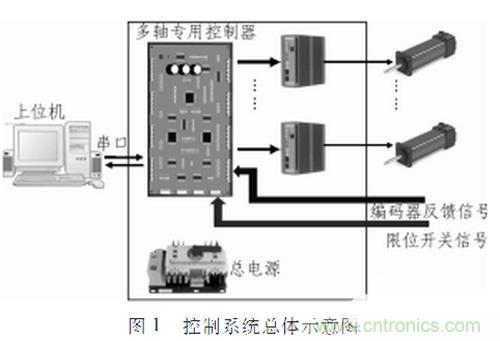 多軸控制器與上位機、電機驅(qū)動器等配合使用,圖1為采用多軸控制器組成的控制系統(tǒng)總體示意圖。控制器接收上位機發(fā)送的控制指令,分析處理并產(chǎn)生相應(yīng)的方向信號、脈沖信號給驅(qū)動器,從而達(dá)到控制電機運行的目的。為了提高系統(tǒng)的控制精度,將電機的編碼器信號作為反饋信號輸入給控制器(內(nèi)部實現(xiàn)自動辨向及四細(xì)分)。在各軸運動過程中,專用控制器對電機運行的絕對位移進行記錄,并且可以實時地將各軸的絕對位置信息上傳給上位機。另外在電機運行的過程中,為了保證電機運行的安全性,控制器還采用了限位信號反饋實現(xiàn)全硬件保護措施。