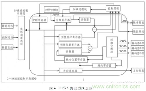 專用控制器在完成整個控制的過程中,arm只負(fù)責(zé)指令解析、控制指令發(fā)送、實時數(shù)據(jù)上傳等任務(wù),fpga才是多軸專用控制器的核心。通過Verilog HDL語言在fpga內(nèi)部實現(xiàn)了加減速曲線、編碼器信號辯向及四細(xì)分、絕對位移記錄等功能。圖3為電機控制的整體輸入、輸出信號圖,通過片選信號CS、讀有效信號rd_enable、寫有效圖信號wr_enable進行電機通道選擇。圖4給出了1#通道控制的fpga內(nèi)部邏輯示意圖,下面將逐一對各主要模塊進行詳細(xì)介紹。