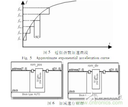 為了更有效、更理想地控制電機的運行,在fpga內(nèi)部設(shè)計了加減速曲線模塊。文中采用了一種近似指數(shù)加減速曲線的方法,如圖5為近似指數(shù)加速曲線,減速曲線與之對稱。速度等距分布,那么在該速度級上保持的時間不一樣場。為了簡化,用速度級數(shù)N與一個常數(shù)C的乘積去模擬并且保持的時間用不熟來代替。因此,速度每升一級,電機都要在該速度級上走NC步(其中N為該速度級數(shù))。