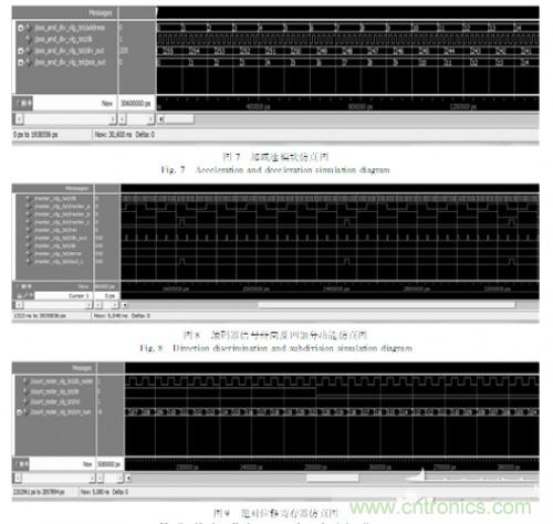 在QuartusⅡ編譯環(huán)境下成功編譯之后,調(diào)用Modulesim仿真軟件,編寫仿真程序,使之產(chǎn)生全局時鐘、復(fù)位信號、相位差為90度的A、B相信號和Z相信號。如圖8所示,給出了該多軸控制器中所采用的編碼器信號辯相及四細(xì)分的功能仿真圖。