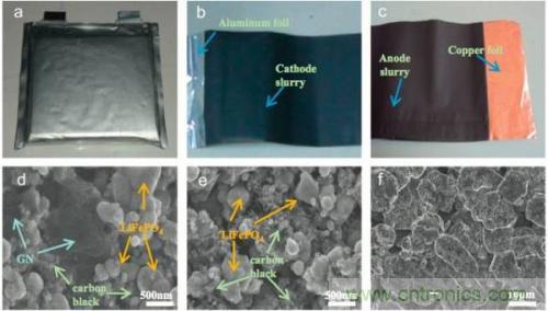實驗中楊全紅的團隊制作了兩種電池,一種是普通的對照組電池,使用了7%的炭黑和3%的導電石墨,實驗組則使用1%的石墨烯和1%炭黑作為導電劑。試驗結果顯示,在相同的涂布量的前提下,使用石墨烯的實驗組電池容量(0.5C充放電)要明顯高于對照組電池,并且兩者的循環性能接近,表明石墨烯能夠搭建起更為高效的導電網絡,從而減少導電劑的用量,提高鋰離子電池的容量(10%),降低電池的極化,提升電池的能量密度。