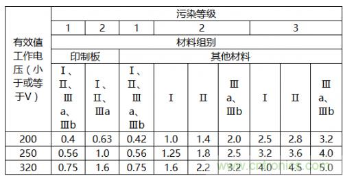爬電距離是兩個導電體沿絕緣材料表面的最短距離,而最小爬電距離只由表格2N來確定;具體查表方法如下: