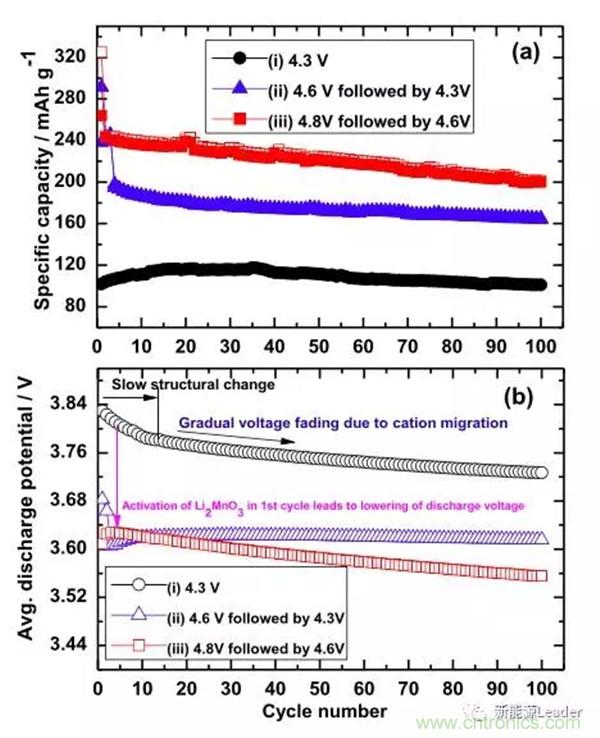 富鋰材料活化制度是影響其循環(huán)性能的一個重要因素,以色列科學家Prasant Kumar Nayak等研究顯示,活化電壓和循環(huán)電壓對于富鋰材料的循環(huán)性能都有十分顯著的影響,例如他們發(fā)現(xiàn)Li1.17Ni0.25Mn0.58O2在經過4.8V活化,并在2.3-4.6V之間循環(huán)的電池,雖然容量高達242mAh/g,但是循環(huán)性能很差,并且循環(huán)100次后電壓平臺從3.62V衰降到了3.55V,而經過4.6V活化,并在2.3V-4.3V之間循環(huán)的電池,雖然比容量較低僅為160mAh/g,但是循環(huán)性能優(yōu)異,并且循環(huán)100次未出現(xiàn)平臺電壓衰降,如下圖所示,而沒有經過高電壓活化的材料,容量較低僅為100mAh/g左右,可見富鋰材料的活化制度和循環(huán)制度對于富鋰材料的循環(huán)具有巨大的影響。
