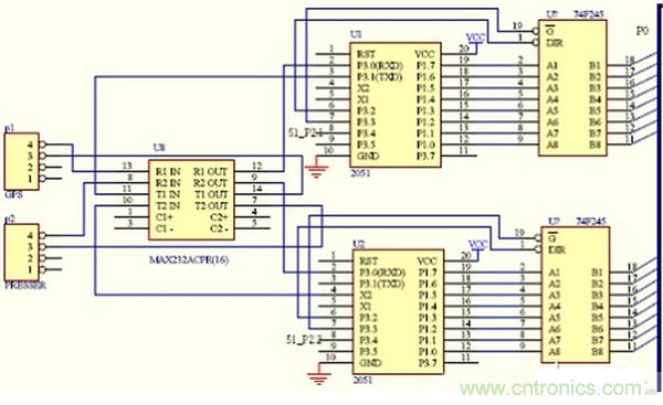 · 各從機上電初始化后接收傳感器串行數據,然后通過P1口接收主機地址,當地址與自己相符后,調整245方向并由245向主機發送傳感器數據,此過程由握手線負責控制。
