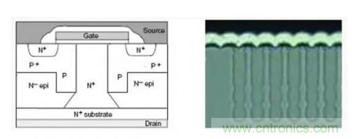 通常,高壓的功率MOSFET采用平面型結構,其中,厚的低摻雜的N-的外延層,即epi層,用來保證具有足夠的擊穿電壓,低摻雜的N-的epi層的尺寸越厚,耐壓的額定值越大,但是其導通電阻也急劇的增大。導通電阻隨電壓以2.4-2.6次方增長,這樣,就降低的電流的額定值。為了得到一定的導通電阻值,就必須增大硅片的面積,成本隨之增加。如果類似于IGBT引入少數載流子導電,可以降低導通壓降,但是少數載流子的引入會降低工作的開關頻率,并產生關斷的電流拖尾,從而增加開關損耗。
