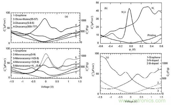 圖4.不同結(jié)構(gòu)石墨烯量子電容:(a) 缺陷石墨烯;(b) N摻雜石墨烯;(c) N、B摻雜石墨烯