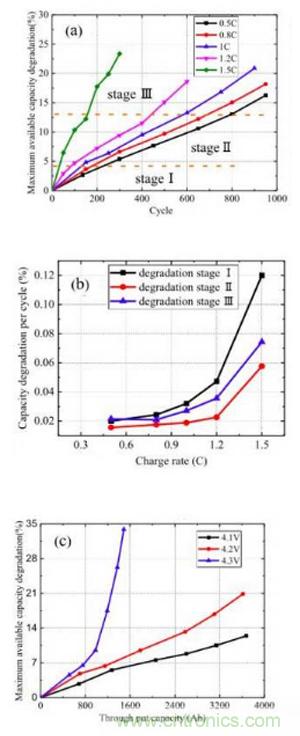 從上述分析我們可以注意到,無(wú)論是充電電流還是充電截止電壓都存在一個(gè)值,當(dāng)充電電流或者電壓超過(guò)這個(gè)值時(shí)就會(huì)導(dǎo)致電池衰降加速,對(duì)于上述電池這個(gè)值是1C和4.2V,當(dāng)充電電流和截止電壓超過(guò)這個(gè)值后就會(huì)加速電池的衰降,當(dāng)小于這個(gè)值時(shí),提高充電電流和截止電壓并不會(huì)顯著的增加電池的衰降速度。對(duì)于充電電流和截止電壓對(duì)電池衰降速度影響的機(jī)理研究顯示,當(dāng)充電電流低于1C時(shí)主要影響的是正負(fù)極活性物質(zhì)損失,而截止電壓低于4.2V時(shí)影響的主要是Li損失,當(dāng)充電電流和截止電壓高于這個(gè)值時(shí),則會(huì)顯著的加速正負(fù)極活性物質(zhì)損失和Li損失。