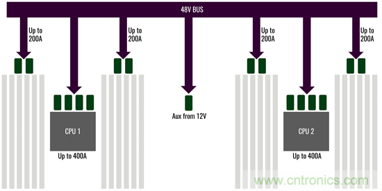 圖字:48V總線;高達(dá)200A;來(lái)自12V的輔助電源
