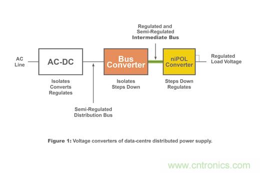 圖字:交流線路;隔離、轉(zhuǎn)換、穩(wěn)壓;半穩(wěn)壓配電總線;總線轉(zhuǎn)換器;隔離、降壓;穩(wěn)壓半隔離中間總線;niPOL轉(zhuǎn)換器;降壓、穩(wěn)壓;穩(wěn)定負(fù)載電壓
