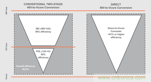 圖字:12V總線;48V總線;傳統(tǒng)的兩級(jí)48V至Vcore轉(zhuǎn)換;IBC(48V-12V);96%效率;POL(12V-1V);90%效率;總效率為86.4%;直接48V至Vcore轉(zhuǎn)換;直接至Vcore轉(zhuǎn)換器;>91%或更高的效率