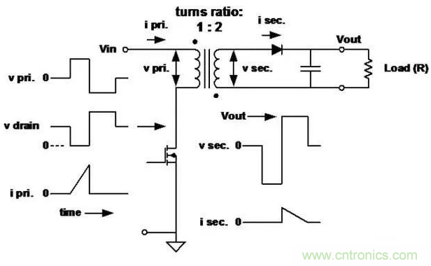 ■此處初級電感很低,用于確定峰值電流和存儲的能量。當初級開關斷開時,能量傳送到次級。