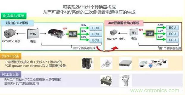其中,一次電源主要是從48V或12V降到5V或3V,用于車載導航等。二次電源是從5V降到1.25到1V,用于ADAS(高級駕駛員輔助系統)等,未來的技術趨勢是更小封裝,開發高附加價值的電源IC。