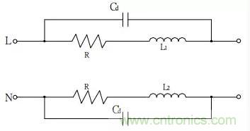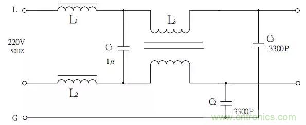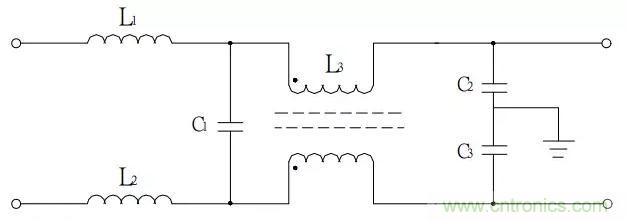 圖中L1、L2、C1構(gòu)成常模濾波器,L3、C2、C3構(gòu)成共模濾波器。