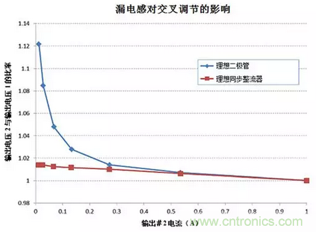 圖5:該圖顯示了兩個輸出之間的交叉調節,其中1號輸出上的1-A負載保持穩定,而2號輸出上的負載不斷變化,從而凸顯了同步整流器如何減輕漏電感的影響。