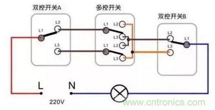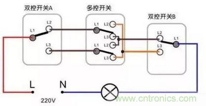這里要新介紹一個(gè)開關(guān),叫做三控開關(guān)。開關(guān)布置的順序是,單開雙控→三控開關(guān)→單開雙控。先看個(gè)三控開關(guān)的圖,能更好理解,如下:
