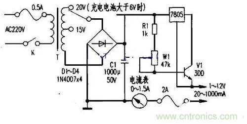 如圖所示,該電路由7805構(gòu)成恒流源電路,通過大功率三極管進(jìn)行擴(kuò)流。