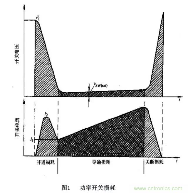 功率開關是典型的開關電源內部最主要的兩個損耗源之一。損耗基本上可分為兩部分:導通損耗和開關損耗。導通損耗是當功率器件已被開通,且驅動和開關波形已經穩(wěn)定以后,功率開關處于導通狀態(tài)時的損耗;開關損耗是出現(xiàn)在功率開關被驅動,進入一個新的工作狀態(tài),驅動和開關波形處于過渡過程時的損耗。這些階段和它們的波形見圖1。