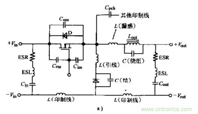 寄生參數是電路內部實際元件無法預料的電氣特性,它們一般會儲存能量,并對自身元件起反作用而產生噪聲和損耗。對設計者來說,分辨、定量、減小或利用這些反作用是一個很大的挑戰(zhàn)。在交流情況下,寄生特性更加明顯。典型的開關電源內部有兩個主要的、存在較大交流值的節(jié)點,第一是功率開關的集電極或漏極;第二是輸出整流器的陽極。必須重點關注這兩個特殊的節(jié)點。