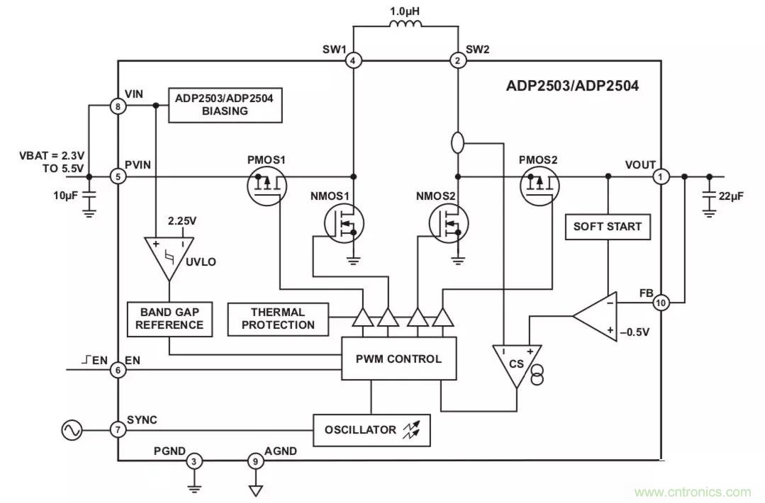 這樣的器件譬如ADI公司的ADP2503和ADP2504降壓-升壓轉(zhuǎn)換器,它們內(nèi)置四個開關(guān)、兩個電容和一個電感。