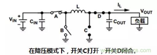 在降壓模式下, 降壓-升壓轉(zhuǎn)換器工作如下圖,Vin大于Vout時,開關(guān)C打開,開關(guān)D閉合。