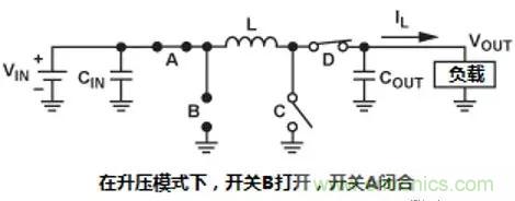 在升壓模式下,Vin小于Vout 時,開關(guān)B打開,開關(guān)A閉合。這時,開關(guān)C和開關(guān)D的工作模式如下圖表示。