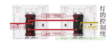 單控開關(guān)每組二個接線孔L接火線L1接燈控制線。雙控開關(guān)每組三個接線孔L接火線或燈控制線,L1丶L2接二根雙控回路線。