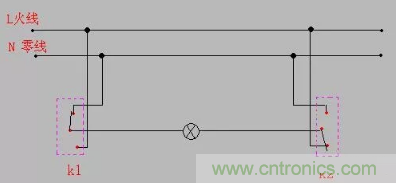 大家看這個接法,兩個單聯(lián)雙控的L1連一起接燈的控制線,兩個L2連一起接的是火線,燈接零線。這種接法也是很安全的,唯一的缺點(diǎn)就是費(fèi)線。