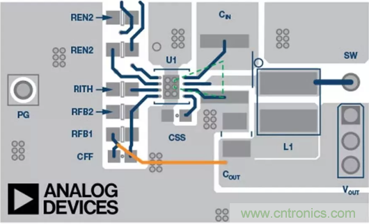圖2所示為ADP2360的示例布局。在本圖中,圖1中的重要熱回路標為綠色。從圖中可見,黃色反饋路徑離線圈L1有一定距離。它位于PCB的內層。