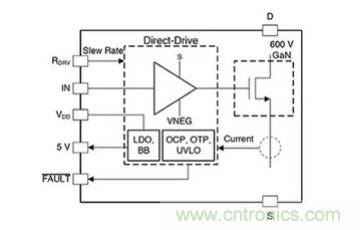 eGaN 價(jià)格降低使芯片制造商能夠解決這兩個(gè)問題。例如,Texas Instruments 在其 LMG3411R070 的集成柵極驅(qū)動(dòng)中集成了70 毫歐姆 (mΩ)、600 伏 eGaN 功率級(jí)(圖 2)。