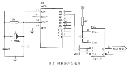利用數字電路產生周期脈沖信號的方法有很多,本文采用的是利用方波發生器4060產生周期為20μs的方波信號,然后觸發單穩態觸發器74LS123產生脈寬為50ns~150ns可調的脈沖周期信號。電路原理圖如圖2所示。