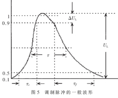 在理想情況下,脈沖調制器輸出的脈沖應為矩形,矩形脈沖頂部平坦,脈沖持續期間雪崩管振蕩器的功率和頻率穩定。但實際上,由于脈沖調制器中不可避免地存在有寄生參量,例如分布電容、引線電感等,而其上的電壓、電流又是不能突變的,這就使得脈沖調制器不可能輸出理想的矩形調制脈沖,一般脈沖波形如圖5所示。