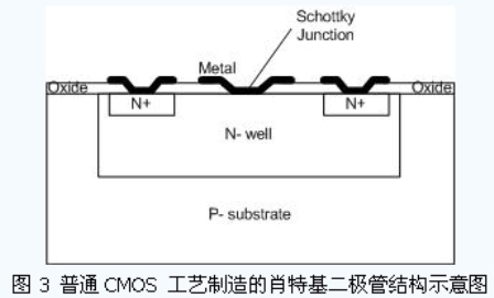 在一般的無源UHF RFID 標簽的應用中,出于成本的考慮,希望芯片電路適合于普通CMOS工藝的制造。而遠距離讀寫的要求對電源恢復電路的功率轉換效率提出了較高的要求。為此,很多設計者采用標準CMOS 工藝來實現肖特基勢壘二極管,從而可以方便地采用多級Dickson倍壓電路結構來提高電源轉換的性能。圖3 所示是普通CMOS 工藝制造的肖特基二極管結構示意圖。在設計中,不需要更改工藝步驟和掩膜板生成規則,只需在版圖上作一些修改,就可以制作出肖特基二極管。