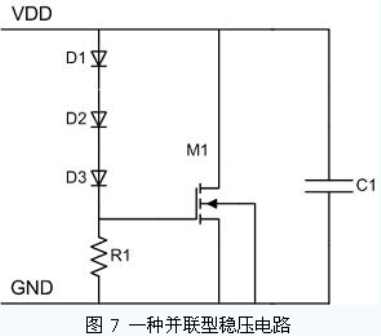 在RFID 標簽芯片中,需要有一個較大電容值的儲能電容存儲足夠的電荷以供標簽在接收調制信號時,仍可在輸入能量較小的時刻(例如OOK調制中無載波發出的時刻),維持芯片的電源電壓。如果輸入能量過高,電源電壓升高到一定程度,穩壓電路中電壓感應器將控制泄流源將儲能電容上的多余電荷釋放掉,以此達到穩壓的目的。圖7 是其中一種并聯型穩壓電路。三個串聯的二極管D1、D2、D3 與電阻R1 組成電壓感應器,控制泄流管M1 的柵極電壓。當電源電壓超過三個二極管開啟電壓之和后,M1 柵極電壓升高,M1 導通,開始對儲能電容C1 放電。
