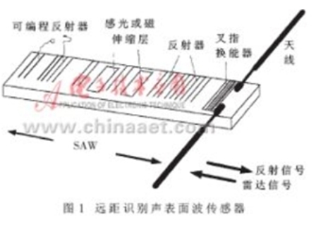 聲表面波傳感器的基本組成如圖1所示。其天線接收到高頻(915MHz中心頻率)激勵后經過叉指換能器IDT(interdigital transducer)將電磁波轉化成聲表面波,然后經過一系列反射器(可編程,包含了識別碼)反射回來,再經叉指換能器轉化成電磁波經天線發射出去,完成反射過程。