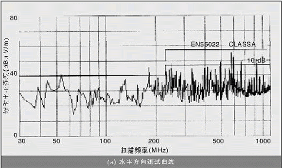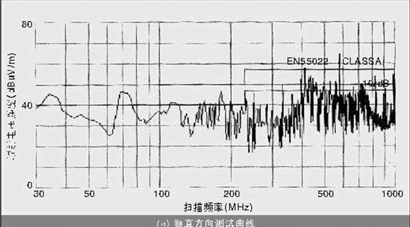 按照接入設(shè)備的電磁兼容(EMC)測(cè)試要求,設(shè)備上電正常運(yùn)行,測(cè)試儀器在30~1 000 MHz的頻率范圍內(nèi)進(jìn)行掃描,其中在30~230 MHz頻率范圍內(nèi)要求電磁干擾(EMI)的準(zhǔn)峰值低于40 dBuV/m,在230~1000 MHz頻率范圍內(nèi),EMI的準(zhǔn)峰值低于47 dBuV/m。測(cè)試的結(jié)果是:在垂直方向上,412.5 MHz處超標(biāo)4.08 dB,577.5 MHz處超標(biāo)3.5 dB;在水平方向上,577.5 MHz處超標(biāo)7.9 dB,參見圖1。