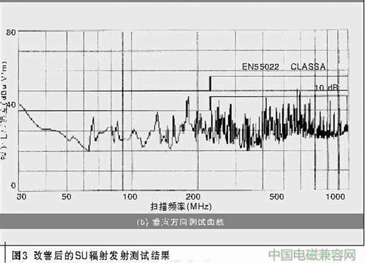 筆者用高速示波器測(cè)量出網(wǎng)絡(luò)接口板的工作地噪聲(Vp-p)為96 mV,中頻板工作后,噪聲增至130 mV以上。此測(cè)量方法可能存在偏差,但總體的趨勢(shì)是2塊單板同時(shí)工作后,的確增加了地線噪聲,對(duì)EMI有一定的影響,只不過影響是有限的。