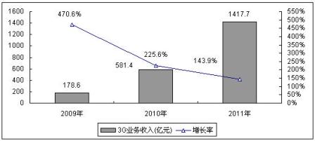 圖2 2009-2011年中國3G業(yè)務收入規(guī)模與增長預測