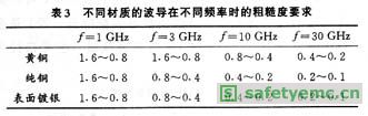 波導表面粗糙度越低,加工難度越大,制造成本也越高。為了降低成本、提高經濟效益,在不同頻段,控制波導管表面粗糙度的要求是不同的。頻率越高,波長越小,粗糙度值要求也越低。表3為實際工作中總結出的銅、黃銅、鍍銀波導在不同頻率時的粗糙度要求,可作為設計時的依據。