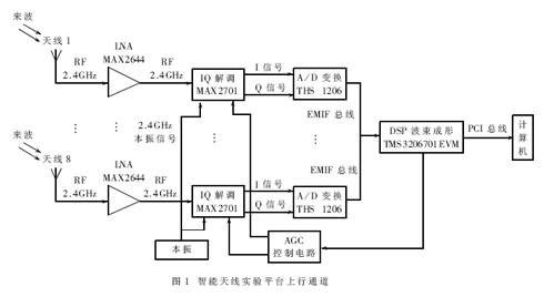 為了開(kāi)展智能天線技術(shù)研究,結(jié)合實(shí)際情況,筆者設(shè)計(jì)了一個(gè)基于TI公司TMS320C6701數(shù)字信號(hào)處理器的智能天線實(shí)驗(yàn)平臺(tái)。該平臺(tái)采用8單元天線陣列,工作頻率為2.4GHz,采樣速率為1.5MHz,采用TI公司的TMS320C6701EVM作為數(shù)字波束成形和控制算法實(shí)現(xiàn)單元,用于在實(shí)際信號(hào)環(huán)境下智能天線控制算法測(cè)試、MIMO技術(shù)研究和其他陣列信號(hào)處理技術(shù)的研究。實(shí)驗(yàn)平臺(tái)的上行通道如圖1所示,下行通道如圖3所示。