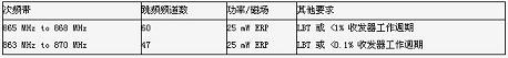 如表三所示,為使用FHSS時(shí),歐洲的擴(kuò)展頻帶上(低于870MHz)所需要的頻道數(shù)量、有效發(fā)射功率(ERP)、及工作週期。當(dāng)符合"說(shuō)前先聽(tīng)(listen-before-talk,LBT)"或是工作週期有效率限制值時(shí),便可有高達(dá)7MHz的頻寬可供使用,以往則只有2MHz的范圍。