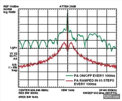 工程人員也需要了解到歐洲法令中,一項(xiàng)加諸在暫態(tài)功率上的限制新規(guī)格,也就是當(dāng)發(fā)射器在正常運(yùn)作中開(kāi)關(guān)時(shí),落入臨近頻譜的功率。將此限制加入最新法令中的目的,是要避免頻譜飛散(spectralsplatter)。
