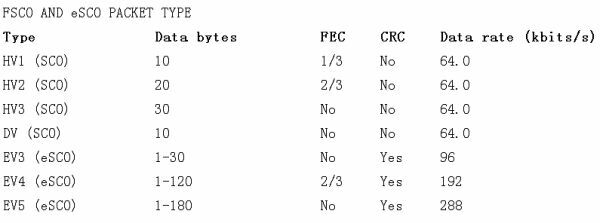 SCO提供了全雙工的音頻。藍牙連接中的主設備發送一個數據包給從設備,而從設備在接下來的時隙中給予響應。盡管能夠對特定的包類型作出選擇,這個特定的包類型還是象征性地被留在了藍牙芯片組內的連接管理固件中。藍牙技術定義了傳輸SCO的四個包類型(見表)。