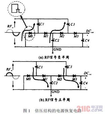 倍壓結(jié)構(gòu)的電源恢復電路如圖1所示。圖中的二極管在實際應(yīng)用時通常用MOS管替代。輸入正弦交流信號RFin=VAsint。在RFin負半周期時,M0導通,C1充電。C1兩端能夠獲得的最大電壓為VA-Vd,其中,Vd為MOS管M0兩端的電壓降。