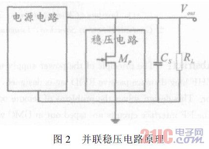 通常的并聯(lián)式穩(wěn)壓結(jié)構(gòu)如圖2所示。當Vout大于穩(wěn)壓電路開啟閾值時,穩(wěn)壓電路內(nèi)的瀉流管Mp開啟,從瀉流管瀉放電流,使電壓降低。