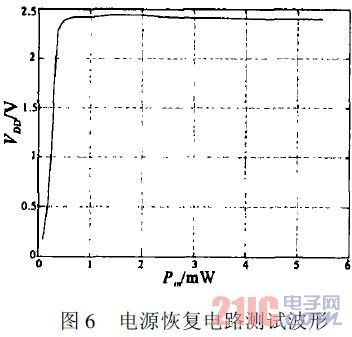 根據(jù)芯片測試結(jié)果,該射頻接口電路能夠在讀寫器4W等效發(fā)射功率下距讀寫器4m處為射頻標簽芯片提供足夠的工作電壓,并且在芯片近場時能夠有效地穩(wěn)定電源電壓。解調(diào)信號基本正常可用。因此,該射頻接口電路可滿足超高頻遠距離無源射頻標簽芯片的要求,具有實用意義。