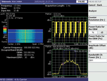 政府規(guī)定要求控制發(fā)射信號(hào)的功率、頻率、帶寬。這些規(guī)定防止有害干擾并保證每個(gè)發(fā)射者都是頻帶內(nèi)其他用戶的友好鄰居。對(duì)于許多頻譜分析儀特別是通常用于脈沖信號(hào)能量測(cè)量的掃頻頻譜分析儀,進(jìn)行此類測(cè)量是具有挑戰(zhàn)性的。RTSA 能夠分析一個(gè)完整的分組發(fā)射過程的能量特點(diǎn),也能直接測(cè)量跳頻信號(hào)的載波頻率,而無需將信號(hào)置于一個(gè)跨度的中心。按一下按鍵,分析儀就能識(shí)別一個(gè)瞬時(shí) RFID 信號(hào)的調(diào)制方式并能夠?qū)β省㈩l率和帶寬進(jìn)行監(jiān)管測(cè)量,使預(yù)一致性(pre-compliance)測(cè)試過程變得非常靈活和方便 [參閱圖2]。預(yù)一致性測(cè)試有助于確保產(chǎn)品一次通過一致性測(cè)試,而無需重新設(shè)計(jì)和重新測(cè)試。