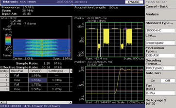預(yù)編程測(cè)量能減少進(jìn)行這些測(cè)試所需的建立時(shí)間。例如,ISO18000-6 C 類型的一個(gè)重要測(cè)量是啟動(dòng)時(shí)間和關(guān)閉時(shí)間。載波能量上升時(shí)間必須足夠快以保證標(biāo)簽采集到使其正常工作的充足能量。信號(hào)也必須迅速達(dá)到穩(wěn)定狀態(tài)。發(fā)射結(jié)束時(shí),載波能量下降時(shí)間必須足夠快,以防止其他發(fā)射受到干擾 [參閱圖3]。