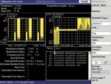 RTSA 也能解調(diào)與標(biāo)簽查詢相關(guān)的符號(hào)或比特。用戶只需選擇相應(yīng)的 RFID 標(biāo)準(zhǔn)、調(diào)制類型和解碼格式。分析儀能自動(dòng)檢測(cè)并顯示鏈路的比特率。為進(jìn)一步提高工程師的生產(chǎn)效率,對(duì)恢復(fù)出的數(shù)據(jù)符號(hào)進(jìn)行了基于功能的顏色編碼(color-coded)。RTSA 能夠自動(dòng)識(shí)別前導(dǎo)符并將那些符號(hào)染成黃色。這易于識(shí)別實(shí)際的數(shù)據(jù)負(fù)荷并與已知值進(jìn)行比較。