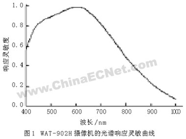 獲得的圖像質(zhì)量直接影響圖像處理程序的復(fù)雜度和檢測結(jié)果。如果采用的光源單色性越好,越接近平行光,則圖片的干涉條紋更清晰,質(zhì)量更好。然而單色激光器或者平行光源體積大,而紅外測試系統(tǒng)的一大特點就是結(jié)構(gòu)簡單、緊湊,而提供窄波段的照明價格比較昂貴,且不易控制,因此選用普通的白熾燈作為光源。為了得到較好的紅外圖片,在鏡頭的上方放置一塊雙面鏡面拋光的硅片,從而過濾掉可見光對圖片的影響。同時,選用超低照度黑白攝像機WAT-902H,它的光譜響應(yīng)靈敏曲線如圖1所示。而紅外線波長為750 nm~1000μm,這樣我們采用普通的光源就可以獲得窄波段的紅外圖像。另外,由于該相機對紅外波段的響應(yīng)靈敏度不高,可以通過增加光強來克服,從而獲得清晰的紅外干涉圖像,為后續(xù)的圖像分析和處理做準(zhǔn)備。