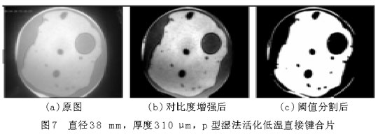 圖6(a)和圖7(a)中,圓形區(qū)域是要鍵合的圓片,其中明區(qū)為鍵合上的地方,暗區(qū)為未鍵合上的地方,圓形區(qū)域(即鍵合圓片)以外為圖像背景。從圖上可以大致地看出空洞(未鍵合區(qū)域)的分布、個數(shù)和大小等。為了獲得更為準(zhǔn)確的數(shù)據(jù)信息,借助圖像處理程序?qū)D片(a)進行對比度增強、平滑、分割等一系列處理,可獲得圖(b),(c),從而得到鍵合率。樣品1的鍵合率為28.12%,鍵合率很低,并且從圖6中空洞的分布可以看出,樣品1鍵合得很不好。樣品2的鍵合率為66.12%。比較圖6和圖7,樣品2的鍵合質(zhì)量明顯優(yōu)于樣品1,可以說明鍵合圓片越薄,越容易鍵合。可以從平板理論理解這一鍵合現(xiàn)象,圓片越薄,界面表面能克服圓片翹曲貼合到一起所需要的力越小。